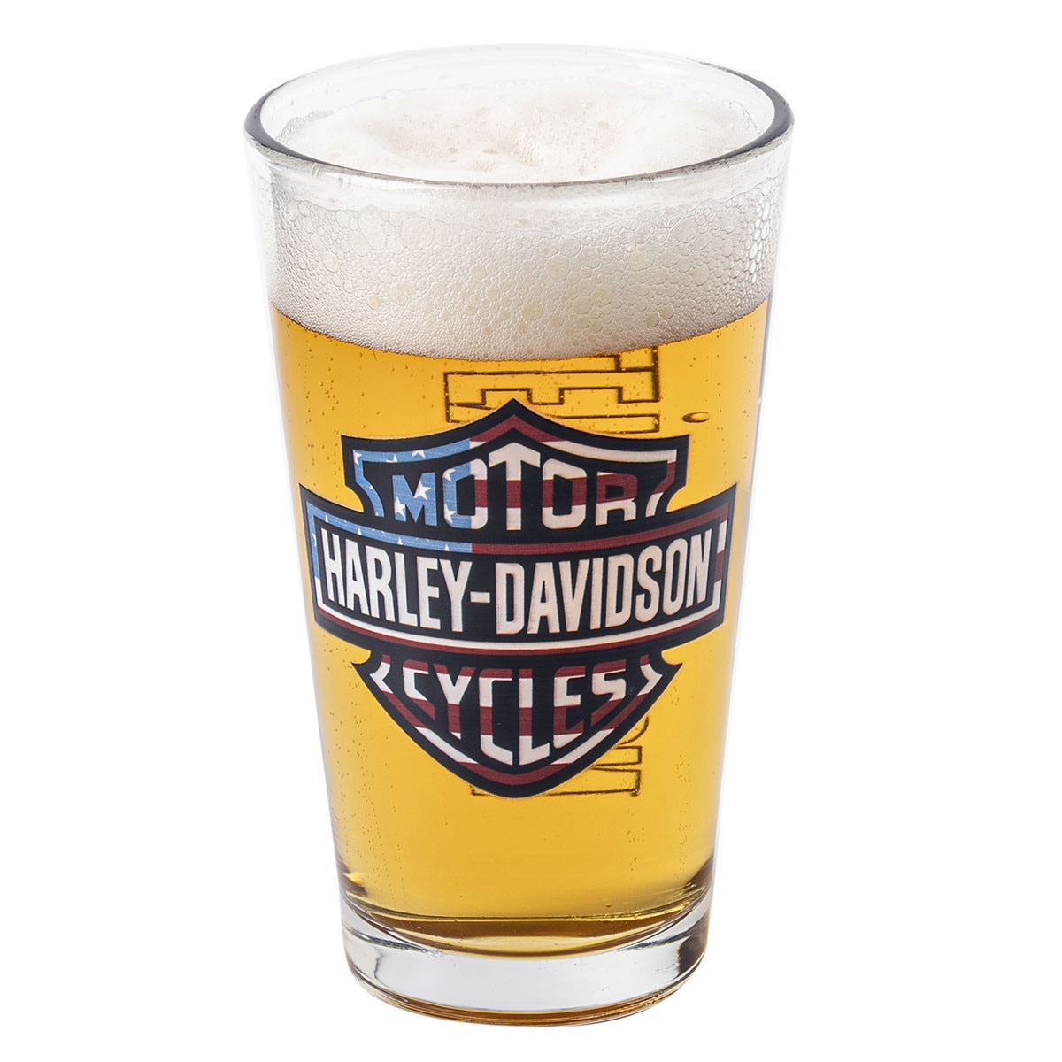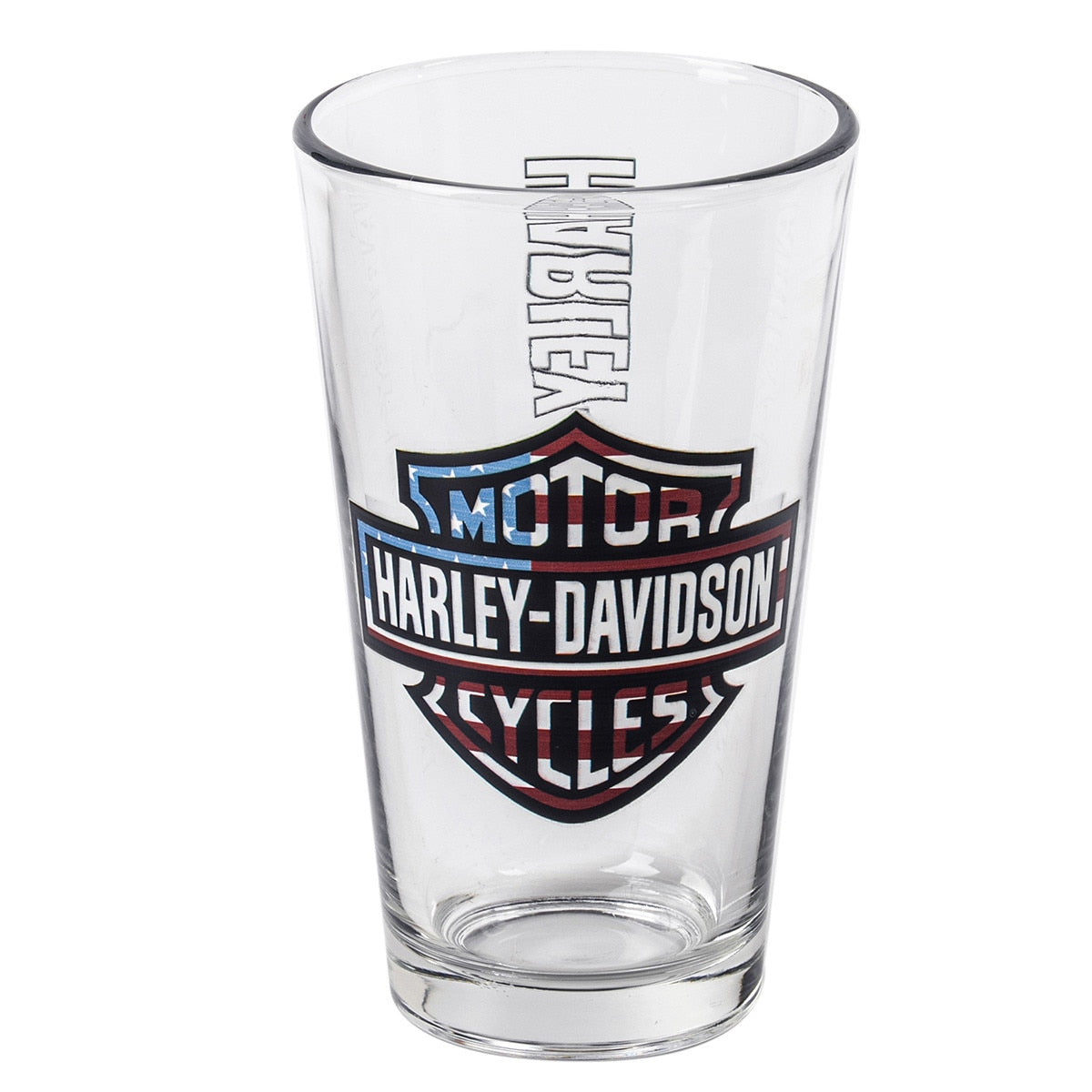 Raise a glass to American pride with this iconic Harley-Davidson pint glass. Featuring the legendary Bar & Shield logo in bold red, white, and blue, this 16 oz. vessel celebrates the spirit of the open road and patriotic heritage that defines the brand. The two-sided graphic ensures your pride shows from every angle—whether you're enjoying your favorite beverage at home or displaying it as a collector's piece. Crafted for durability and style, this official HDX-98760 glass is a must-have for any true rider or enthusiast. Hand wash to preserve the vibrant design and keep the legend alive.