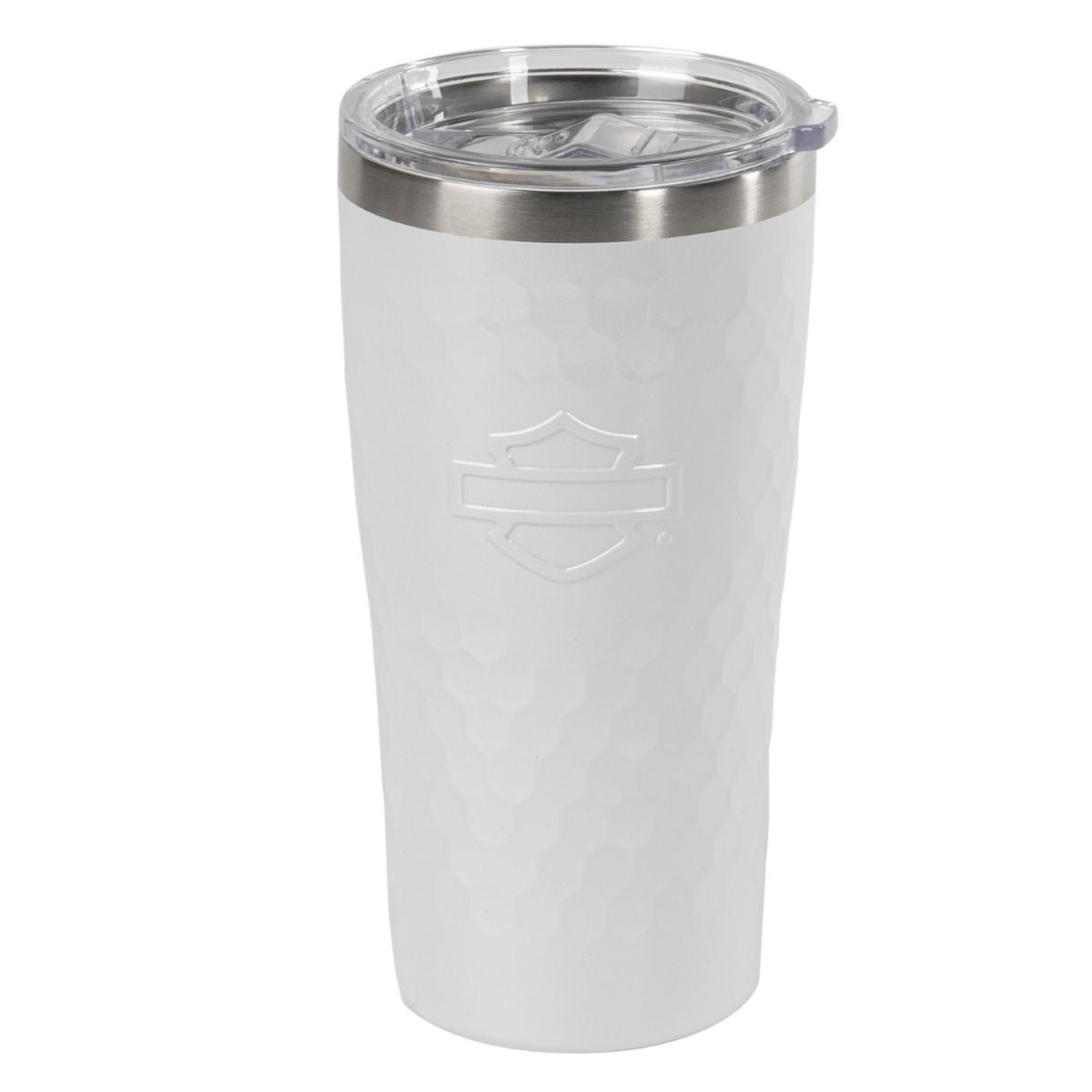Keep your beverages at the perfect temperature with this 20 oz. vacuum-insulated travel mug from Harley-Davidson. Double-wall stainless steel construction maintains heat or cold for extended periods, while the secure slide closure lid prevents spills during your ride. The distinctive embossed honeycomb pattern and open Bar & Shield logo deliver authentic H-D styling. Hand wash recommended; not microwave safe.