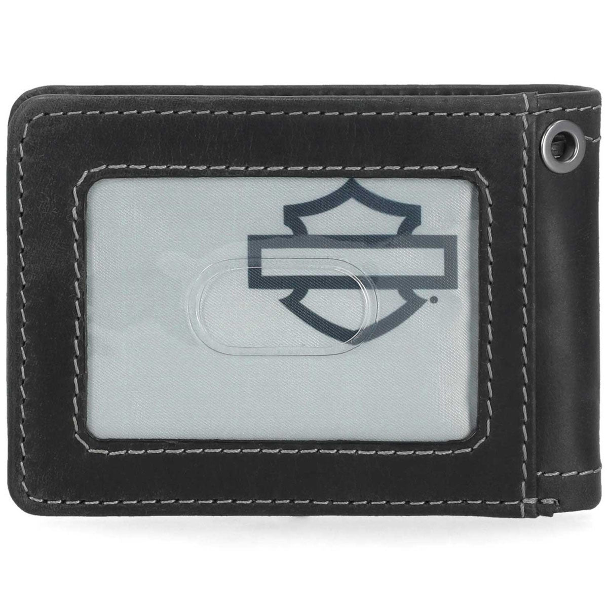 Compact and rugged, this Harley-Davidson wallet combines iconic Willie G Skull imagery with practical functionality. Crafted from genuine leather with distinctive contrast stitching, it measures 4" x 3" for easy front-pocket carry. The integrated ID window and RFID protection safeguard your essentials while the metal skull plaque delivers authentic H-D styling. Built to withstand the demands of the road.