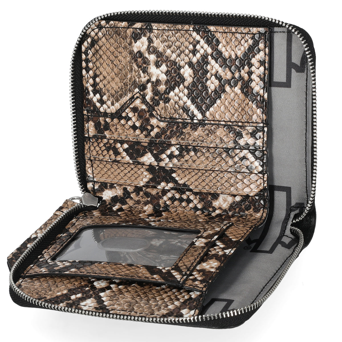Protect your essentials with this compact women's wallet featuring a distinctive python print in rich brown leather. Measuring 5" x 4.25", it combines style with functionality through RFID protection technology that safeguards your credit cards and personal information. The interior layout includes dedicated credit card slots, a secure zipper pocket, and a convenient slip pocket for flexible storage. Topped with the iconic Bar & Shield metal logo, this wallet delivers authentic Harley-Davidson heritage in a practical, everyday accessory designed for the modern rider.