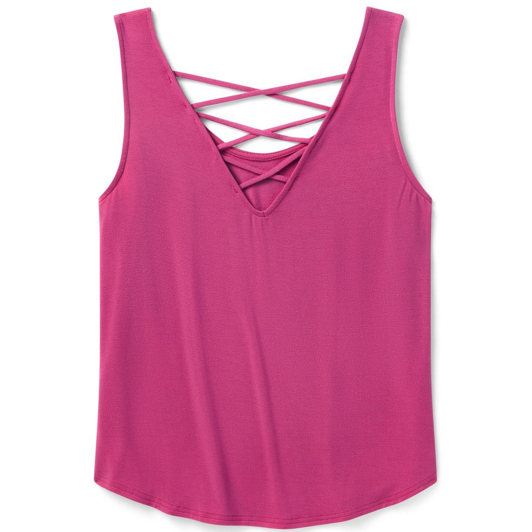 This women's sleeveless tank delivers sophisticated construction with a premium rayon-spandex blend engineered for durability and movement. The garment features a generously scooped front neckline paired with an exceptionally deep back V-cut accented by functional crisscross lacing—a design element that enhances both visual interest and fit customization. The shirttail hem provides contemporary proportioning, while water-based printing technology ensures color longevity and fabric integrity. Rhinestone detailing adds refined embellishment without compromising the tank's wearability. Ideal for those seeking quality craftsmanship in performance-oriented apparel.