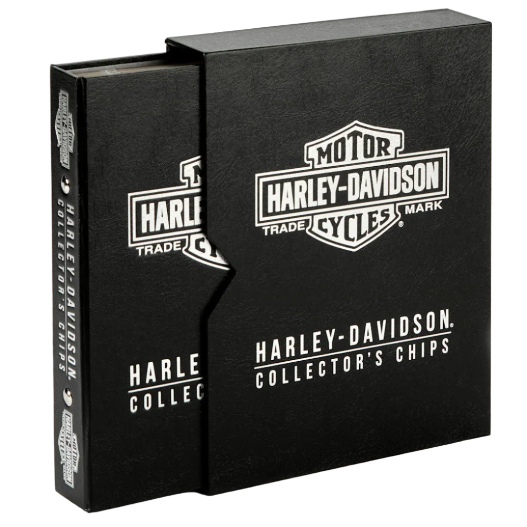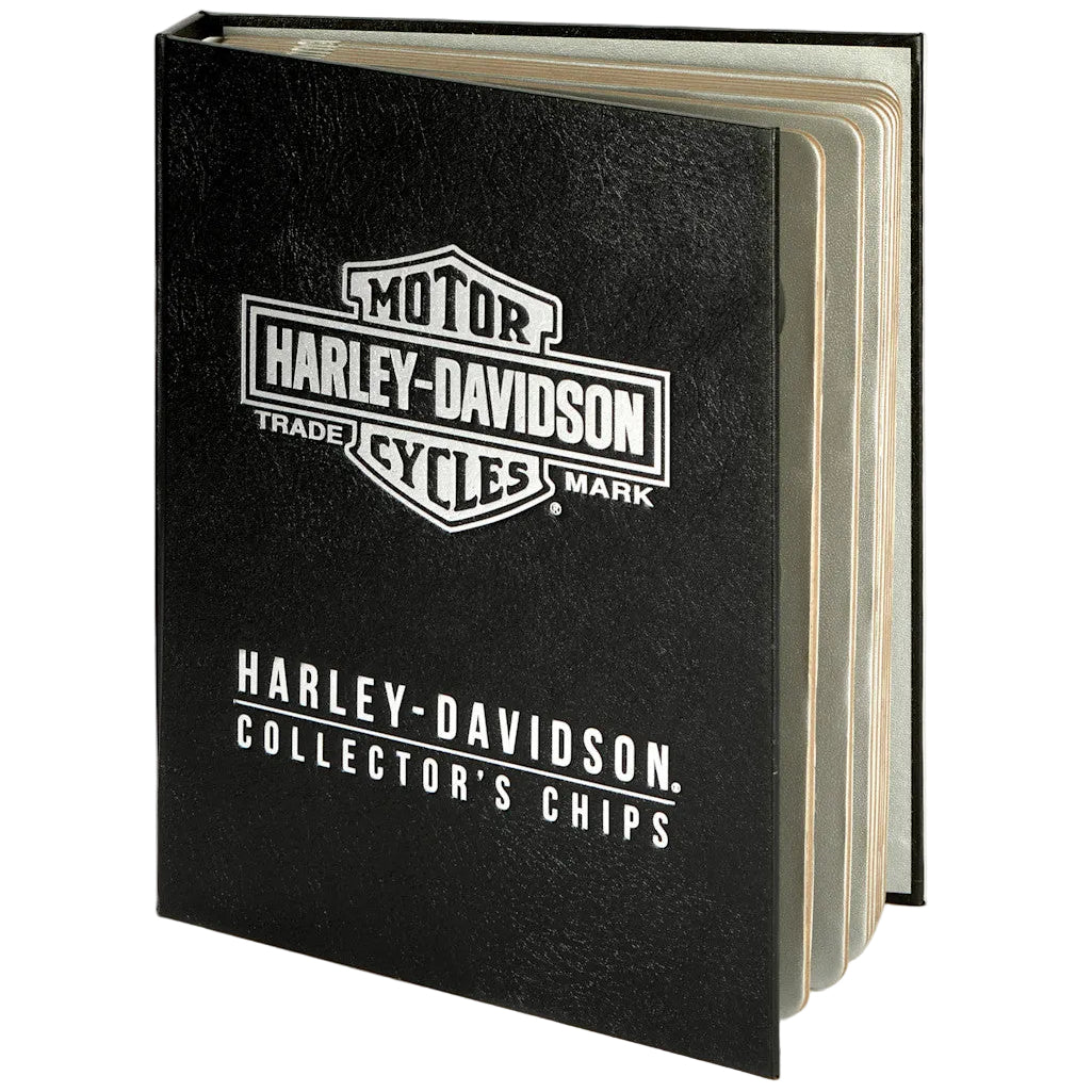 Organize and display your poker chip collection with this premium Harley-Davidson chip album. Featuring the iconic Bar & Shield logo embossed in silver on a black leather grain cover, this 5" x 7" album holds up to 72 chips securely. The innovative plastic slide insert design protects each chip while allowing you to view both front and back without removal. Built for the serious collector who demands durability and authentic H-D branding.