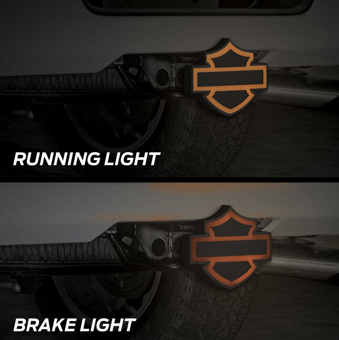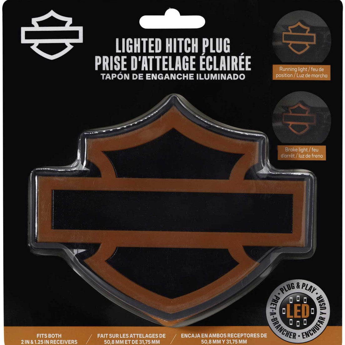 The Harley-Davidson Bar & Shield Silhouette Lighted Hitch Plug fits both 2" and 1.25" receivers, making it versatile for your hitch setup. Its red illumination signals braking, while the orange light stays on when running, enhancing visibility and safety. Crafted from durable, corrosion-resistant plastic, it withstands the elements and keeps your hitch looking sharp season after season. Add a functional and stylish accessory that represents your Harley-Davidson pride.