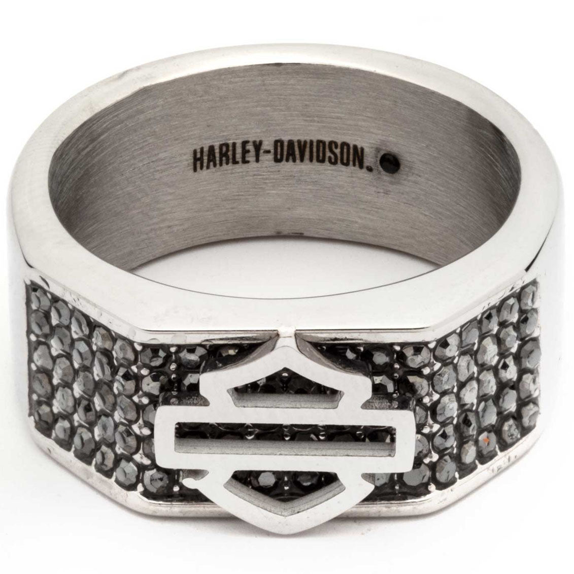 Ride with iconic style. This men's ring features the legendary Bar & Shield logo crafted in durable stainless steel and adorned with striking black crystals for a bold, sophisticated look. Built to withstand the demands of the road, this high-quality piece combines timeless design with everyday durability—the perfect accessory for any Harley enthusiast who demands both heritage and reliability.