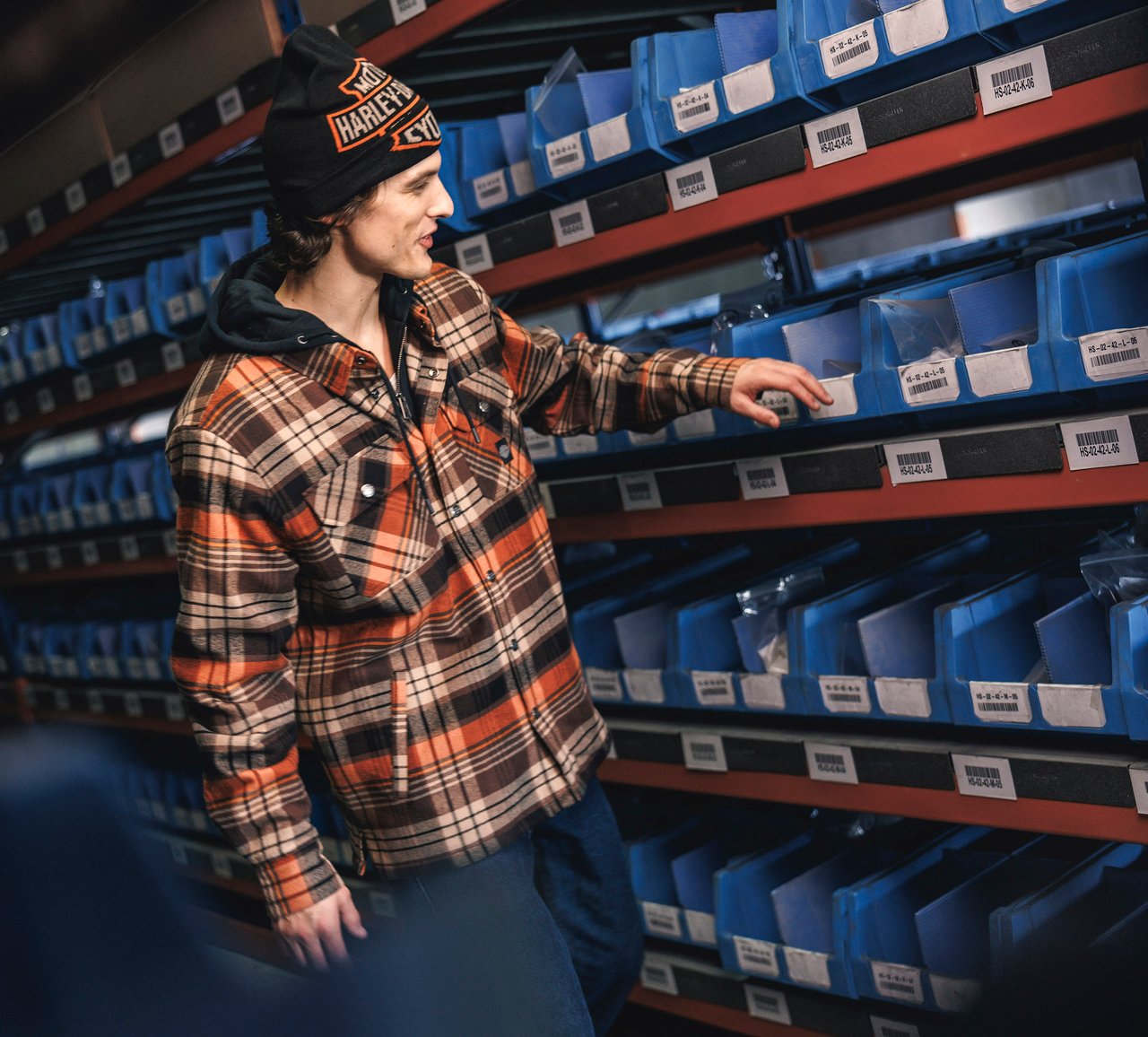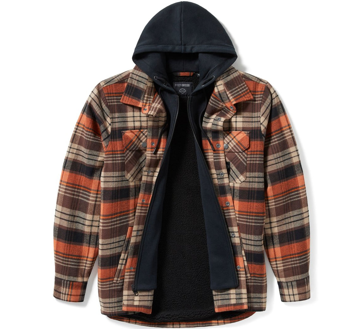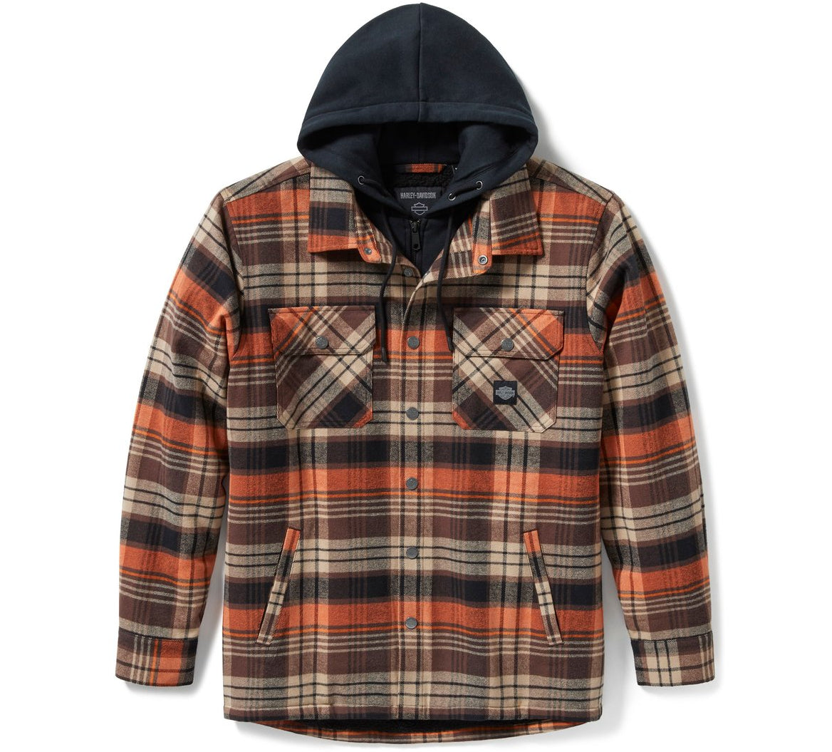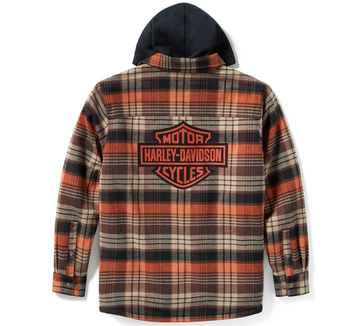 Experience rugged comfort with the Harley-Davidson Men's Bar & Shield Hooded Button-Up Shirt Jacket. Crafted from heavyweight, 100% cotton brushed twill plaid, it features a cozy polyester Sherpa lining and insulated sleeves for warmth. Designed with snap front and cuffs, snap chest pockets, and hand-warmer pockets with hidden snaps, this jacket combines function and style. The contrast quilted lining and jersey-lined hood with adjustable drawstring add extra comfort, while the hidden snap-down collar and side vents ensure a perfect fit in any ride. Embrace iconic Harley-Davidson style with durable woven branding and thoughtful details.