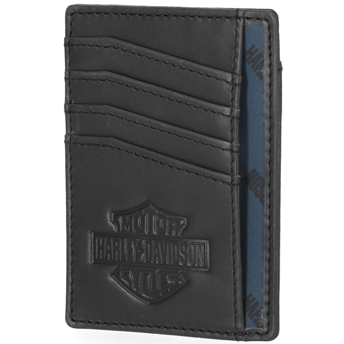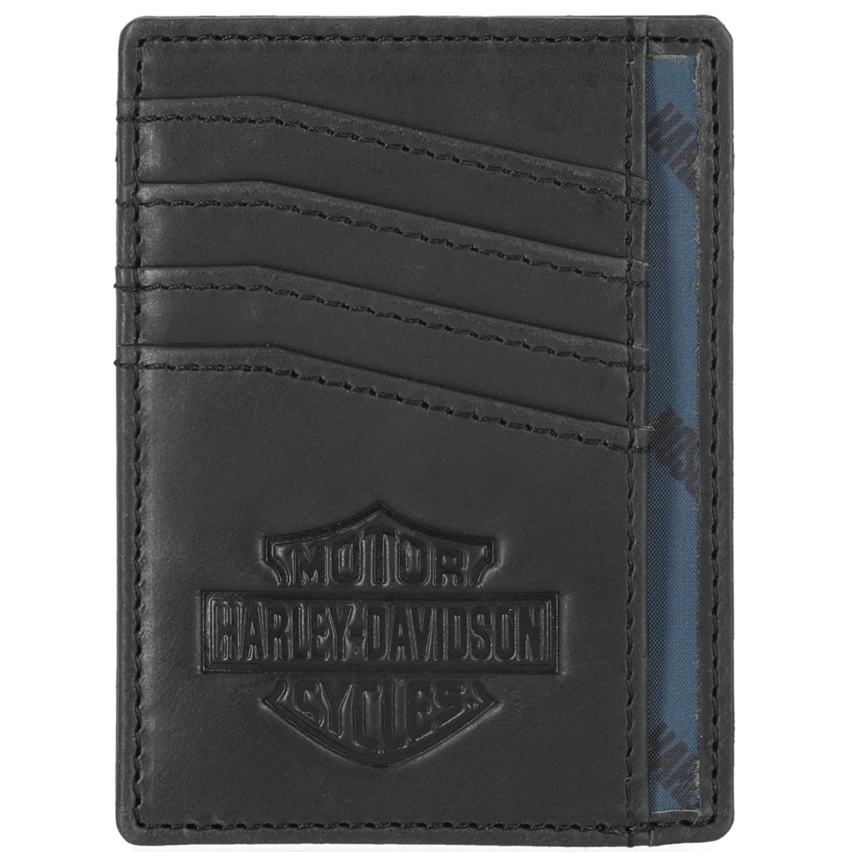 Compact and practical, this Harley-Davidson front pocket wallet features genuine leather construction with a sleek 2" x 4" design. Four card slots keep your essentials organized, while the convenient credit card pull release tab lets you access cards with ease. Perfect for riders who prefer minimal bulk without sacrificing functionality.