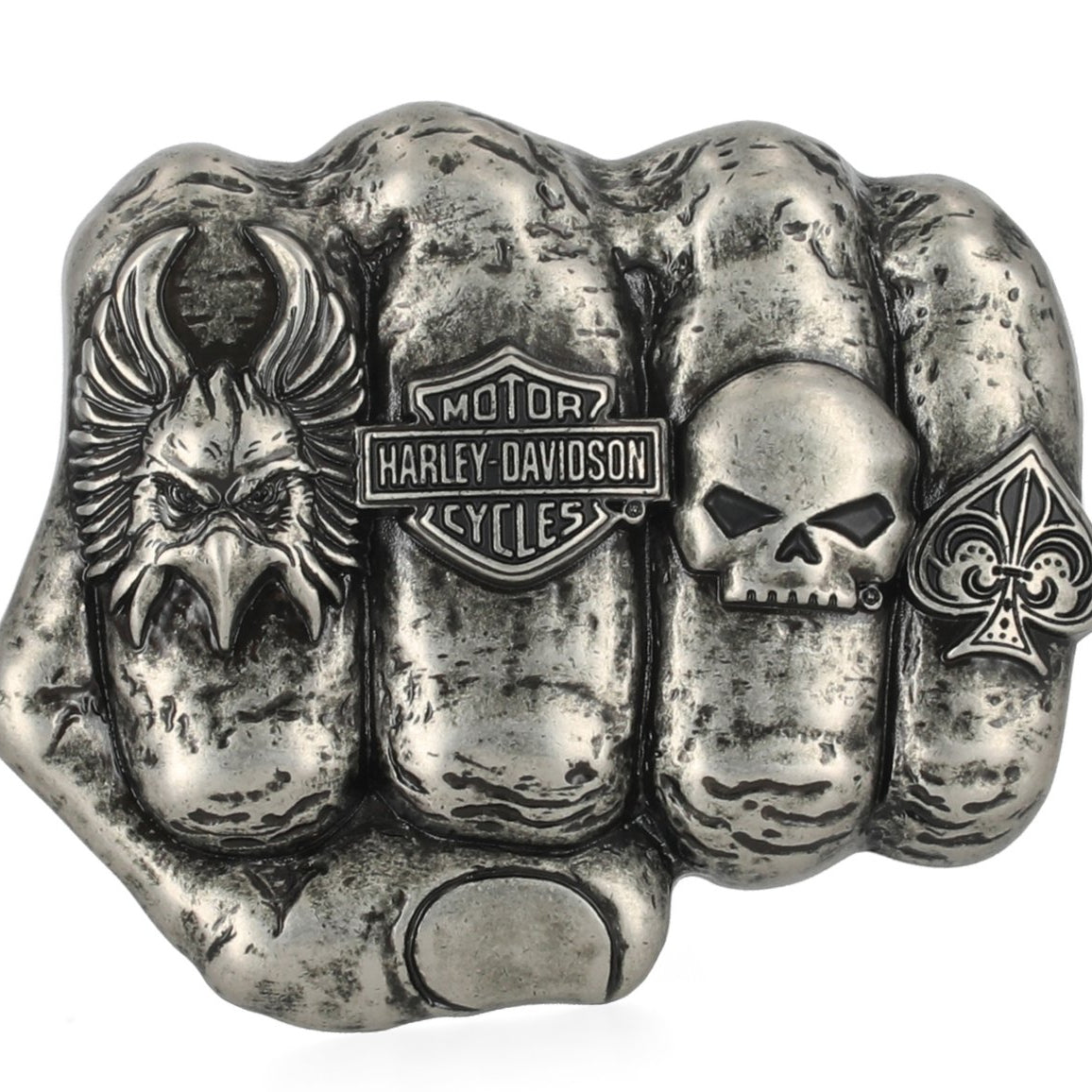Dominate the road with authentic Harley-Davidson style. This heavy-duty knuckle belt buckle features a bold fist-forward graphic cast in antique nickel, measuring 3.6" x 3" for commanding presence. Built tough to match your ride, the high-quality construction ensures lasting durability through every mile. A genuine statement piece for riders who demand genuine attitude.