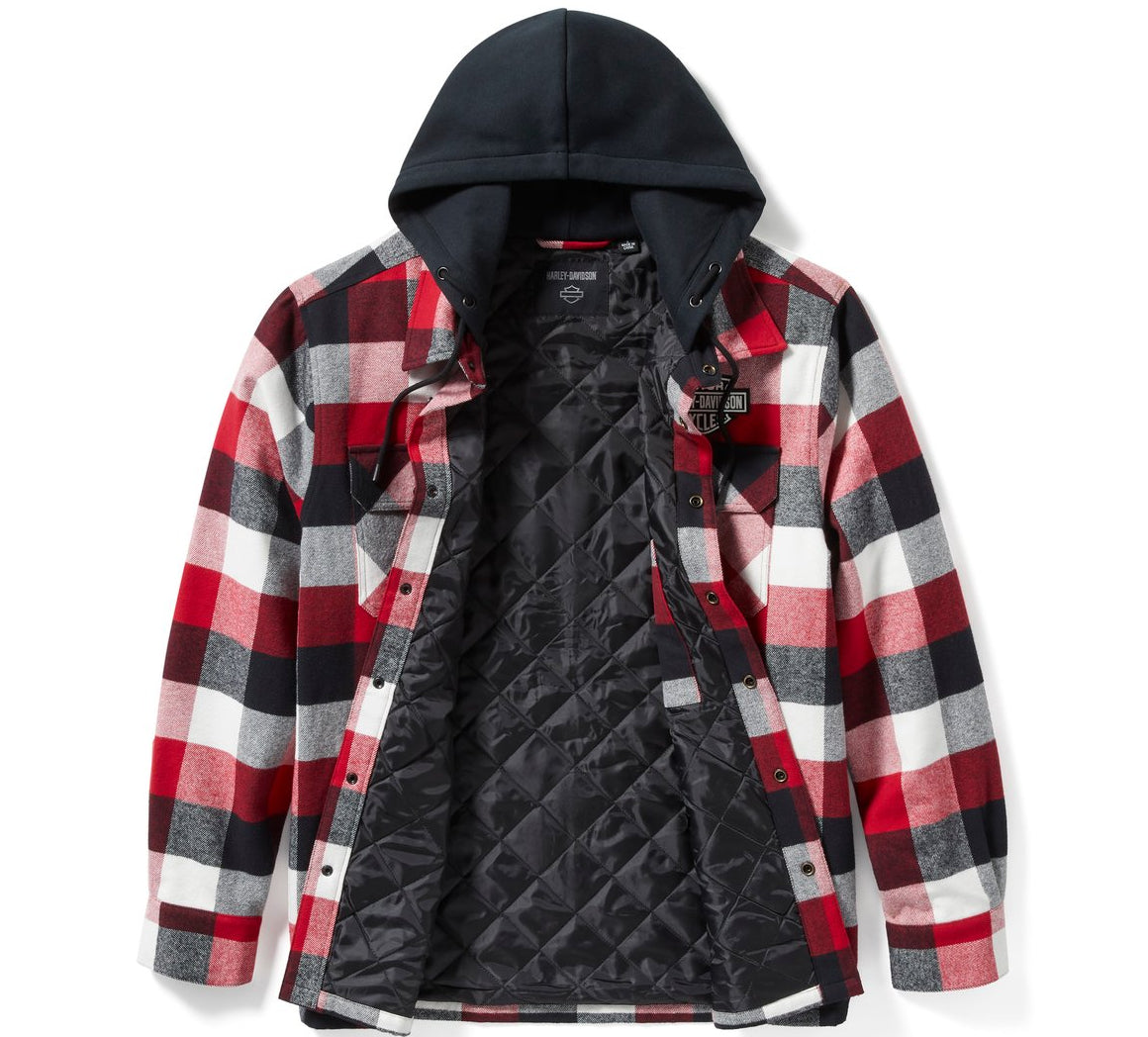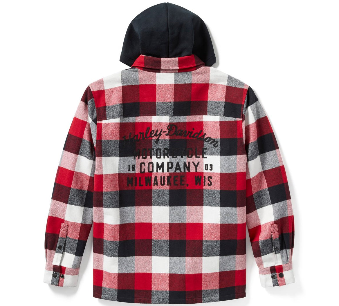 Hit the road in style with this Harley-Davidson Men's Traveler Hooded Jacket, engineered for riders who demand durability and comfort. Crafted from heavyweight 100% cotton brushed twill in a classic plaid pattern with polyester taffeta lining and light polyfill insulation, this jacket keeps you warm without bulk. The snap front and cuffs ensure quick adjustments, while strategically placed pockets—including snap flap chest pockets, hidden snap hand-warmer pockets, and an interior chest patch—keep essentials secure. A jersey-lined hood with adjustable multi-directional drawstring and hidden snap-down collar add versatility for changing conditions. Side seam vents enhance mobility, and authentic chainstitch graphics with printed jersey patches deliver that unmistakable Harley attitude. Built for the open road and everyday adventure.