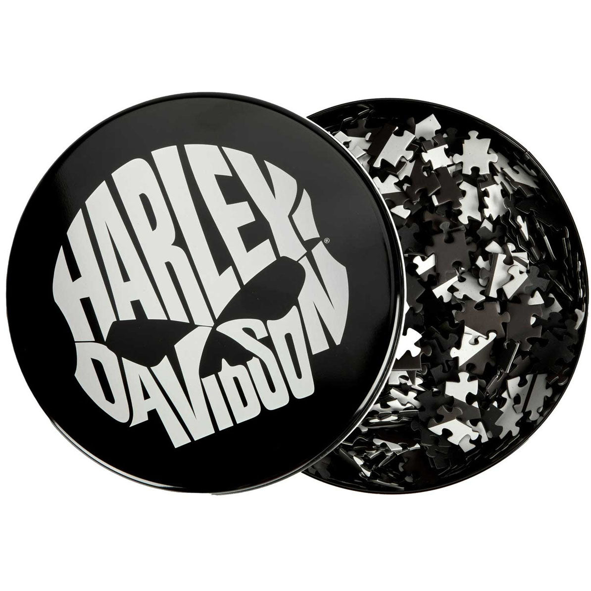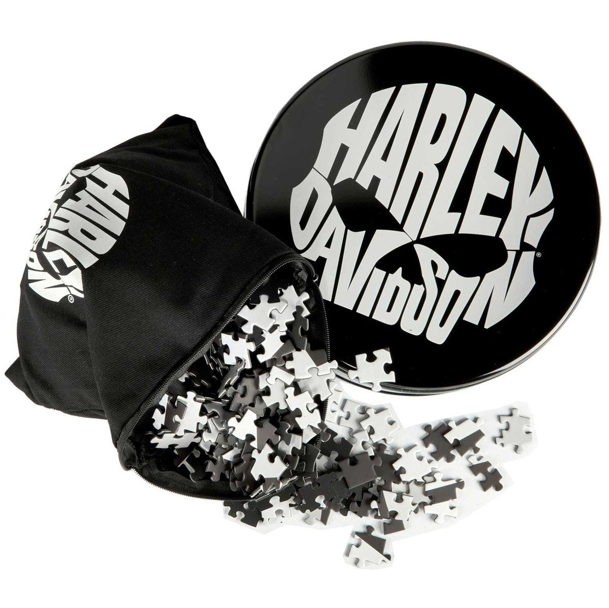 Harley-Davidson Willie G Skull 1000 Piece Puzzle w/ Metal Tin, Black/White DW6082 Challenge yourself with this iconic 1000-piece puzzle featuring the legendary Willie G Skull design in striking black and white. Once completed, the finished puzzle measures 26.5 inches round—a substantial display piece for any enthusiast. Pieces are conveniently stored in a durable cotton zip bag for easy organization and transport. The collectible round metal tin adds authentic appeal and serves as premium packaging for storage or gifting. Perfect for riders and Harley fans seeking a rewarding puzzle experience that celebrates the brand's most recognizable imagery.