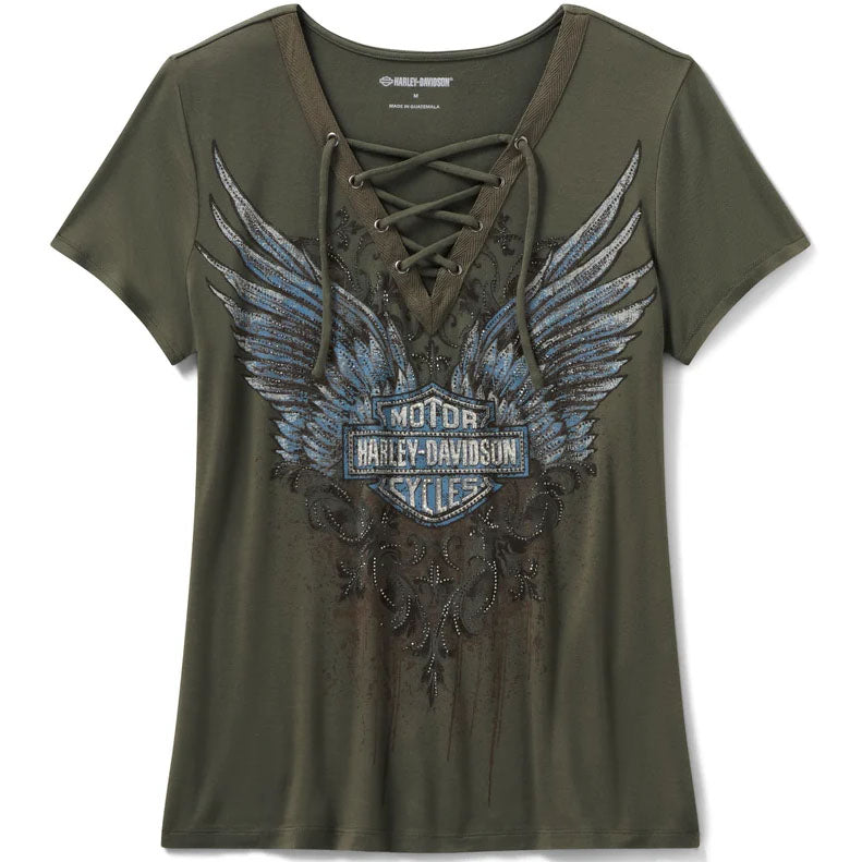 Harley-Davidson Women's Bling Laced Front Short Sleeve Shirt, Green 96632-25VW