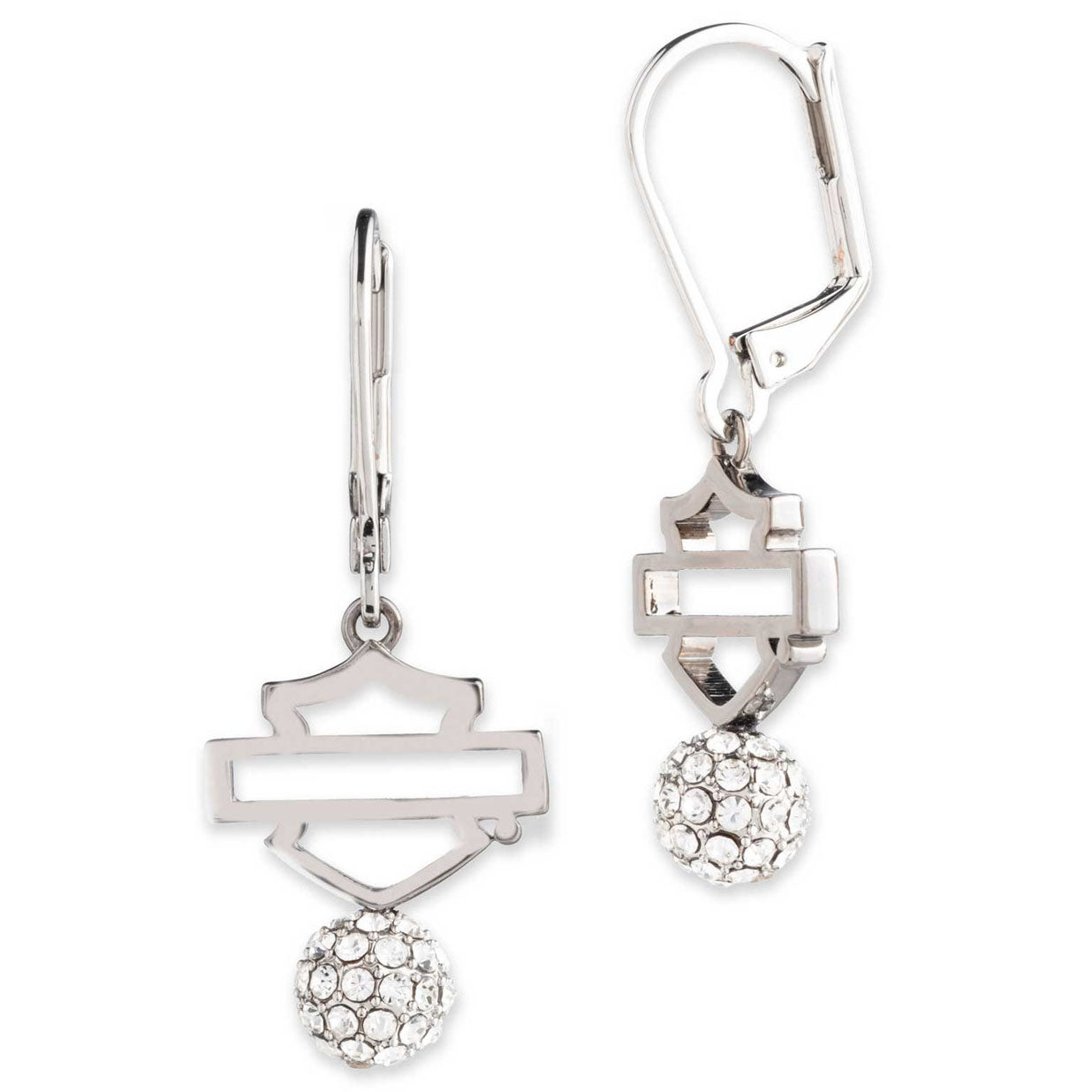 Elevate your Harley-Davidson style with these stunning drop dangle earrings featuring the iconic open Bar & Shield logo. Crafted from durable brass with a lustrous silver finish, these earrings showcase eye-catching crystal fireball accents that catch the light beautifully. Perfect for riders and enthusiasts who want to express their passion for the brand with elegance and flair. A must-have accessory that combines timeless design with modern sparkle.