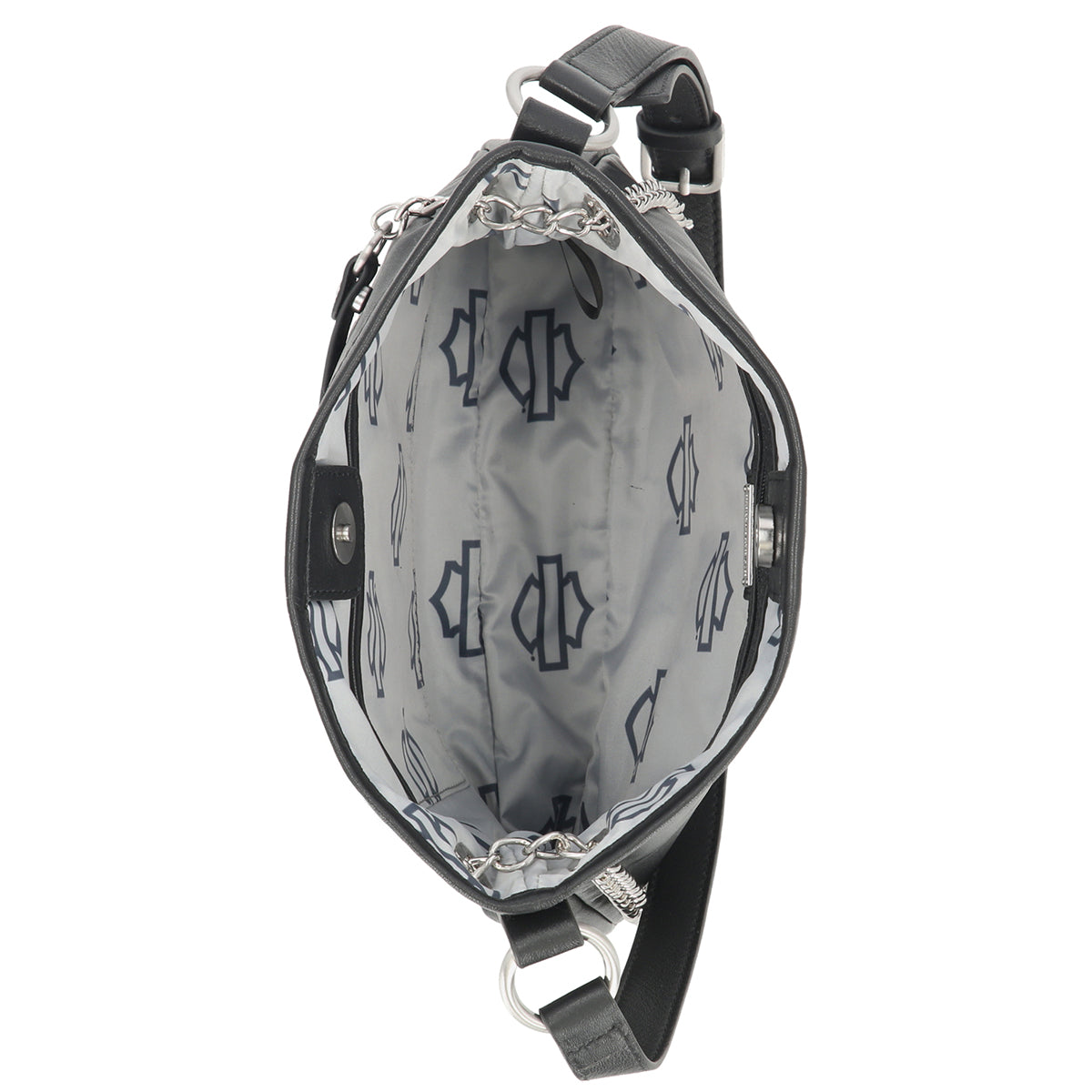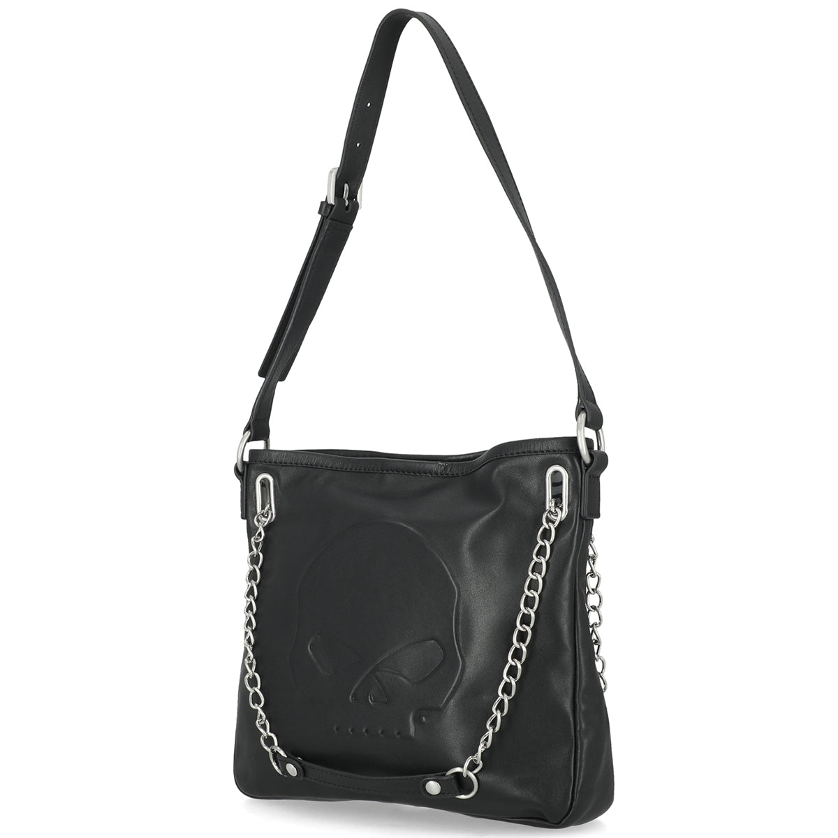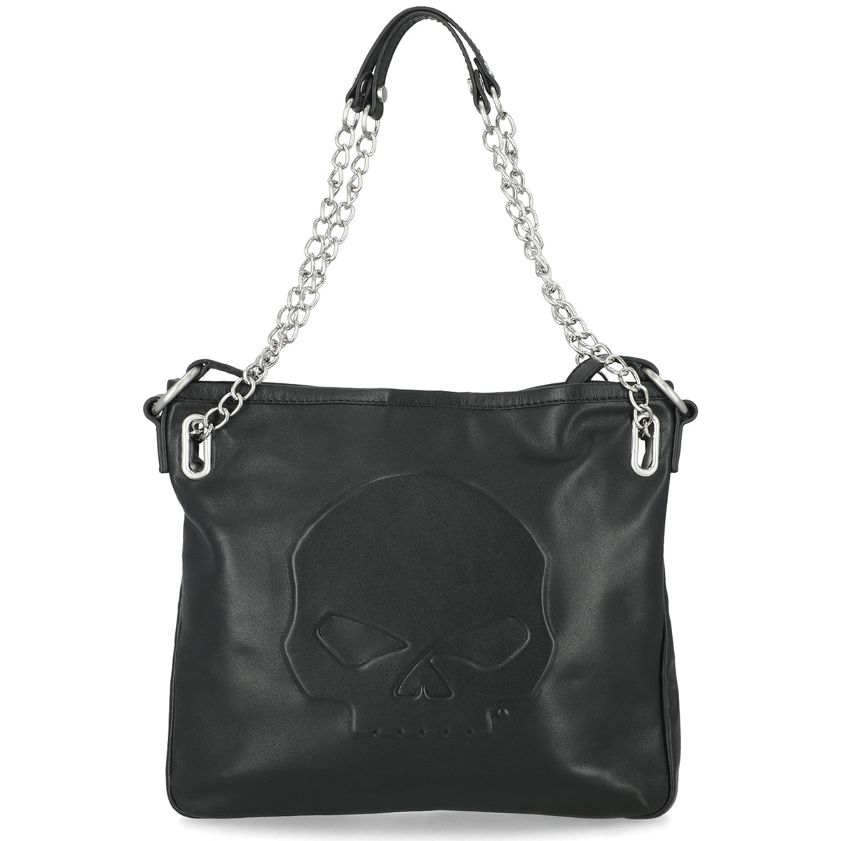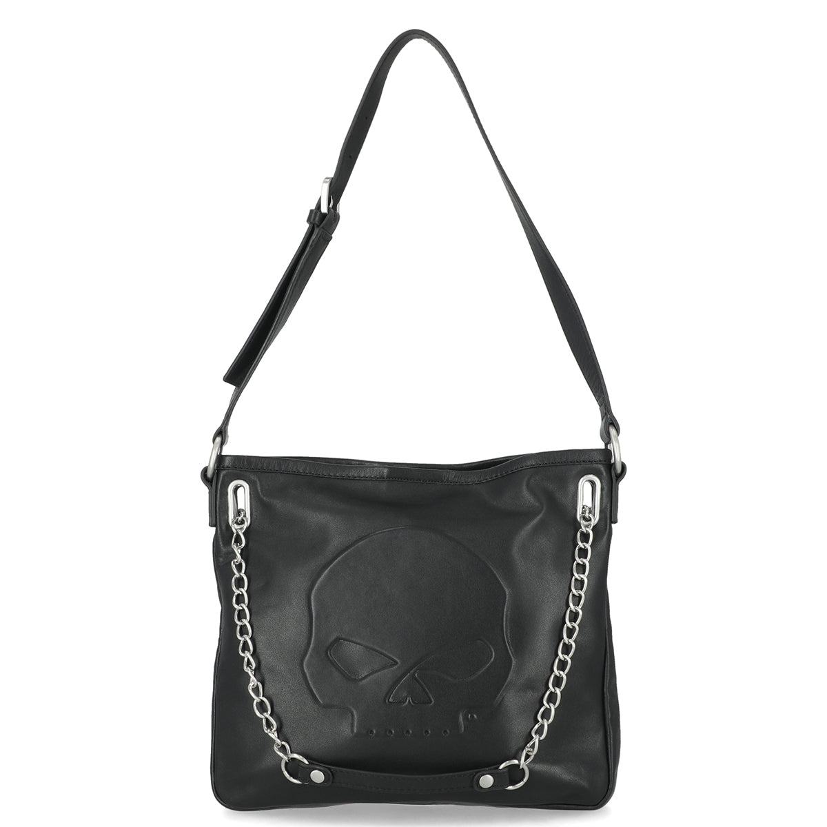 Carry your Harley pride with authentic style. This genuine leather shoulder purse features the iconic raised Willie G. Skull design in brushed nickel, making a bold statement wherever you ride. The compact 10" x 9" x 2" size fits essentials perfectly, while the magnetic snap closure keeps your belongings secure. Convertible chain strap and adjustable shoulder strap give you versatile carrying options—wear it crossbody or on your shoulder. Smart organization includes an interior front slip pocket and back zipper pocket for valuables. Built tough from genuine leather, this purse is as dependable as your bike.