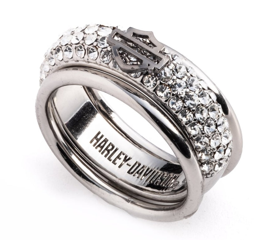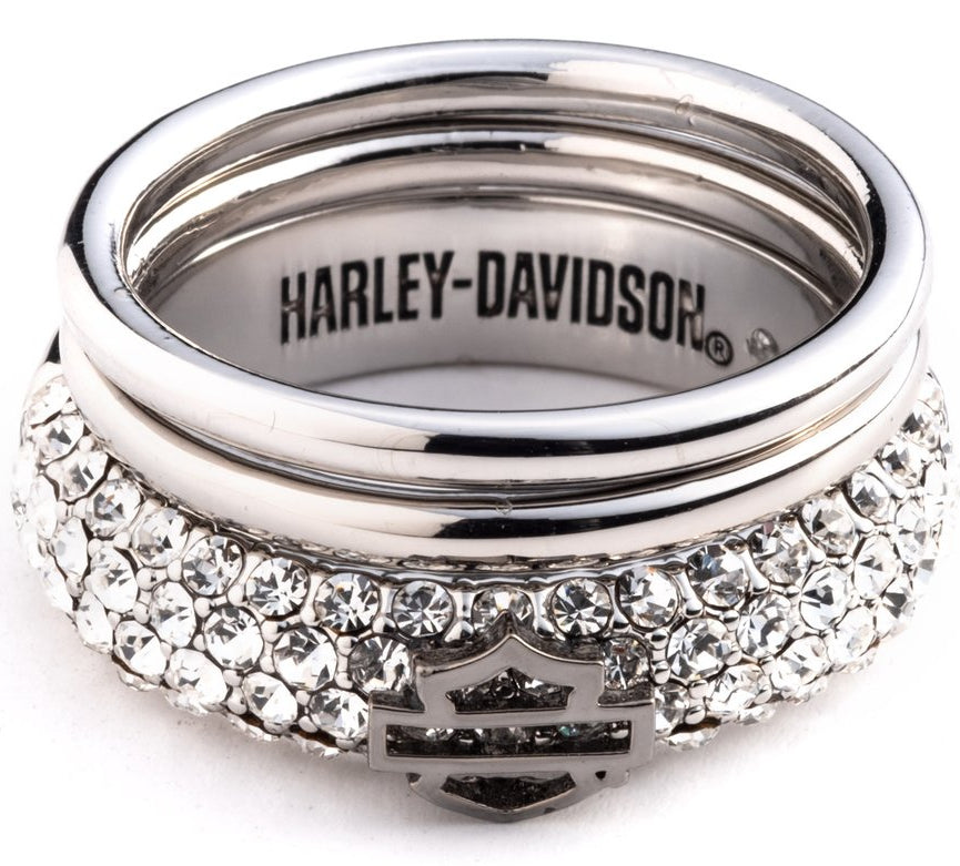 Elevate your Harley-Davidson style with this stunning set of three sterling silver stack rings. Each piece features the iconic Bar & Shield logo, with one ring showcasing a sparkling crystal pave band that catches the light beautifully. The complementary shiny silver bands complete the collection, offering versatile styling options for any occasion. Crafted from genuine sterling silver, these rings deliver timeless elegance and authentic brand pride. Perfect for stacking or wearing separately, this set is an essential addition to any rider's jewelry collection.