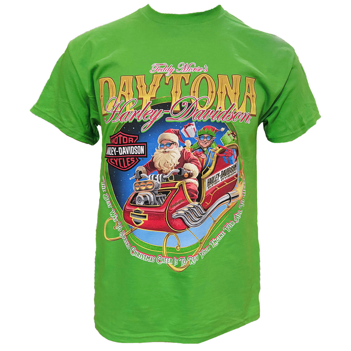 Teddy Morse's Daytona Harley-Davidson Men's Santa's Motor Sleigh Christmas Short Sleeve Shirt, Green