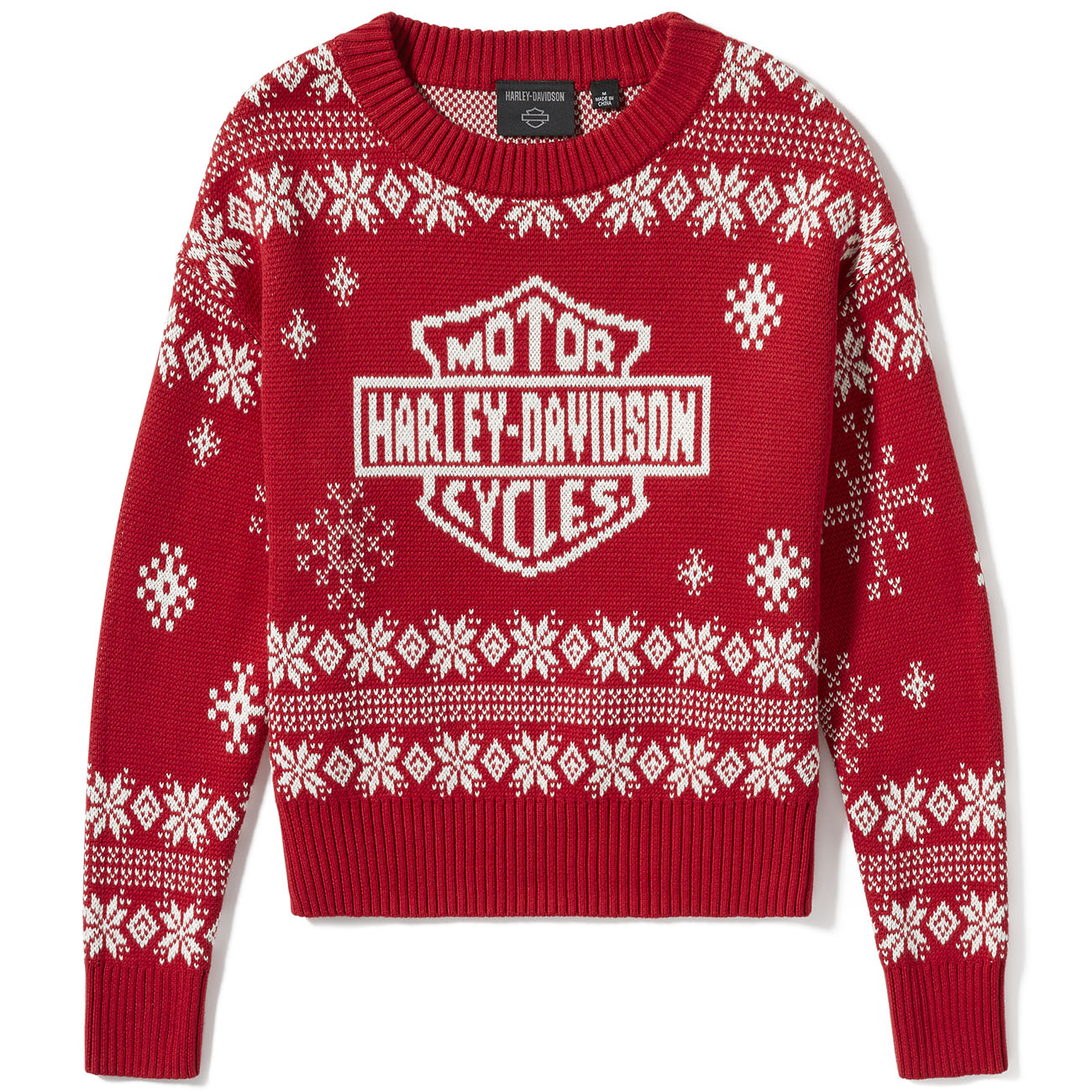 Celebrate the holiday season in style with the Harley-Davidson Women's Harley Holiday Sweater. Crafted from 100% cotton yarn, this long sleeve shirt offers a soft, breathable feel for all-day comfort. The rib-knit neckline, cuffs, and hem ensure a perfect fit, while the custom allover Christmas-themed intarsia knit graphics add festive flair. Ideal for holiday gatherings or casual rides, this vibrant red sweater brings warmth and Harley-Davidson spirit together beautifully. Embrace the season with timeless comfort and iconic design.