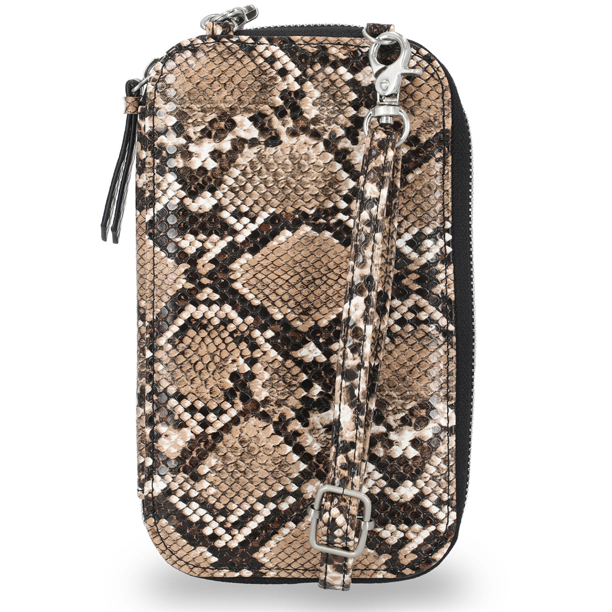 Carry your essentials with confidence using this Harley-Davidson Women's Python Print Wallet. Crafted from durable printed python PU leather with a striking Bar & Shield logo, this compact case measures 4.25" x 7.5" x 1.25" and features a brushed nickel finish for refined style. The zip-around design secures your phone, cards, and cash, while integrated RFID protection safeguards your sensitive information. An adjustable, detachable shoulder strap offers versatile carrying options—wear it crossbody or remove it for pocket carry. Built for the modern rider who demands both functionality and authentic Harley-Davidson heritage.