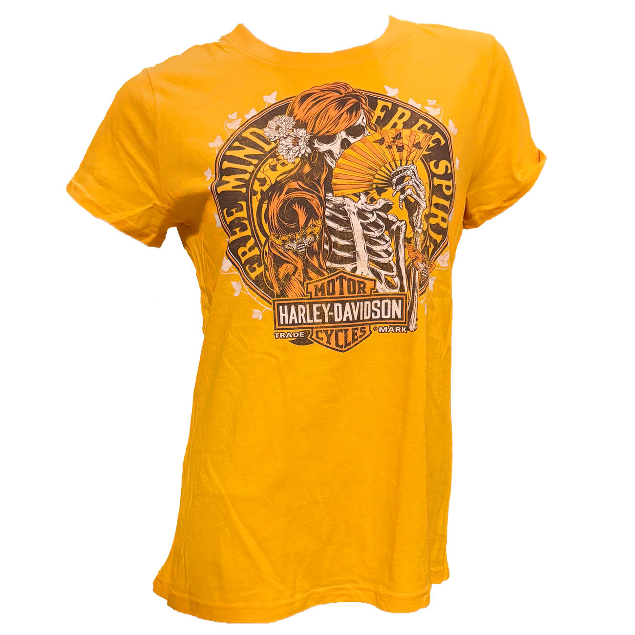 Celebrate your free spirit with this Harley-Davidson x Travis Bailey Women's Short Sleeve Shirt in Gold Yellow. Crafted from 100% ring-spun cotton, it offers a soft, comfortable fit perfect for everyday wear. The front showcases a bold free spirit skeleton design, while the back features Teddy Morse's iconic Daytona Harley-Davidson Daytona Beach, FL script. This distinctive shirt blends art and heritage, making it a standout addition to your wardrobe. Embrace your individuality and ride in style with this unique collaboration.