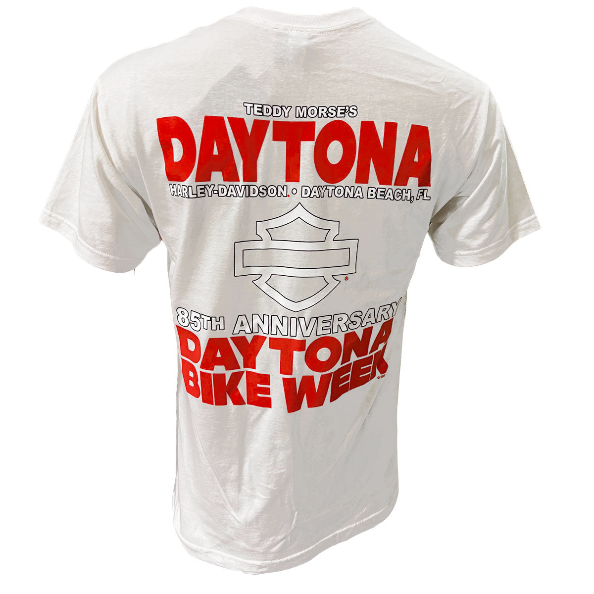 Celebrate the legendary 85th Bike Week with this premium cotton tee featuring bold graphics that honor Daytona's iconic motorcycle culture. The front showcases a striking shark-style design, while the back displays Teddy Morse's Daytona Harley-Davidson scripted branding. Crafted from 100% cotton for comfort and durability, this shirt captures the spirit of America's most famous motorcycle rally. Perfect for riders and enthusiasts who demand authentic gear with genuine heritage.